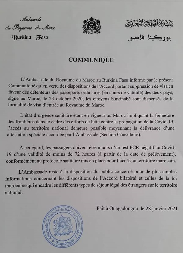 Par le communiqué ci-dessous signé ce jeudi 28 janvier 2021 de sa représentation diplomatique au Burkina, le Royaume du Maroc informe de la suppression de visa d’entrée sur son territoire pour les citoyens burkinabé détenteurs de passeports ordinaires.