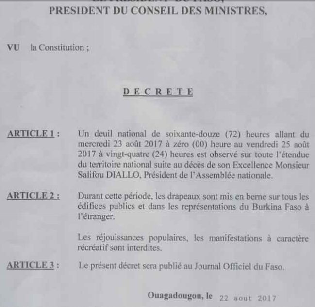 A la UneSociétéDécès de SEM Salif Diallo : Un deuil national de 72 heures à partir de mercredi 23 août 2017 by La Plume du Faso23 août 2017011 Share0